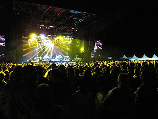 Volgens ons weervoorspellings shou dit niks reën na 17:00 nie. Dit het toe al die tyd tot 16:55 gereën. Daarna het die son onder gegaan en 'n woeste wind het begin waai. (Dit was yskoud, selfs met 'n trui en 'n baadjie). Die Show was baie goed. Die ouens wat vir Elton John die konsert geopen het kan ek nie in fotos beskryf nie. Hulle is nogals uniek. Sien die video: (Dit mag dalk so lyk, maar dis nie 'n piret sjinese film nie, dis 'live'.)
